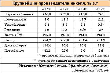 Исходя из данных экспорта, публикуемых ГТК РФ, потребление никеля в России составляет около 20 тыс.т. Кстати, по оценке Минпромэнерго в 2005г. оно выросло на 80,5% (по причине резкого спада в 2004г.).