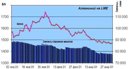 На графике 1 представлена динамика изменения цены и запасов наличного алюминия на Лондонской бирже металлов. Непродолжительный рост котировок после новогодних праздников, который был связан с негативными ожиданиями участников рынка, с наступлением февраля прекратился, и цены вновь начали снижаться. За период с 1 февраля по 30 марта 2001 года цены на алюминий понизились более чем на 16% и находятся сейчас на уровне 1460-1450 $/тонну (начало апреля). Уровни поддержки - 1450 и 1430 $/тонну достаточно сильны. Показав нижний уровень котировок - 1469 $/тонну в конце марта - рынок сразу отыграл вверх до максимального значения перед закрытием - 1480. Уменьшение производства должно обеспечить спрос и некоторую поддержку в цене, но без реальных закупок – цена будет продолжать медленно опускаться. Уровни сопротивления находятся на отметке в 1510 и 1525 $/тонну. Однако, судя по динамике запасов наличного металла, которые на конец марта составили величину в 77 тыс. тонн, в апреле-мае следует ожидать некоторый рост котировок.