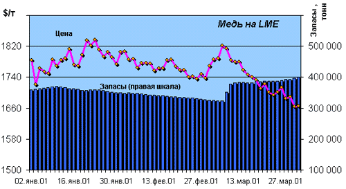 Медь. Ситуация на рынке меди осложняется тем, что практически отсутствует спрос среди высокотехнологичных корпораций. Кроме того, существенно снизился спрос со стороны Китая. Это связано с ростом собственного производства и с существенным увеличением складских запасов, так как на протяжении всего 2000 года Китай делал закупки меди, пытаясь обезопаситься в случае увеличения цены, аккумулировав огромные запасы наличной меди. Только на складах в Шанхае уровень запасов на конец марта оценивается в 200 тыс. тонн. Ко всему прочему многие производители меди в начале года увеличили производство, так как конъюнктура была достаточно благоприятной для продавцов.