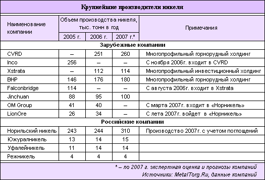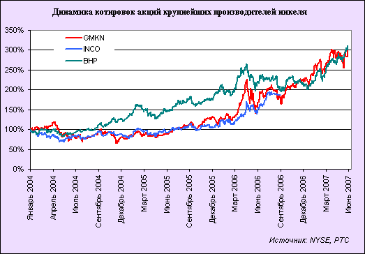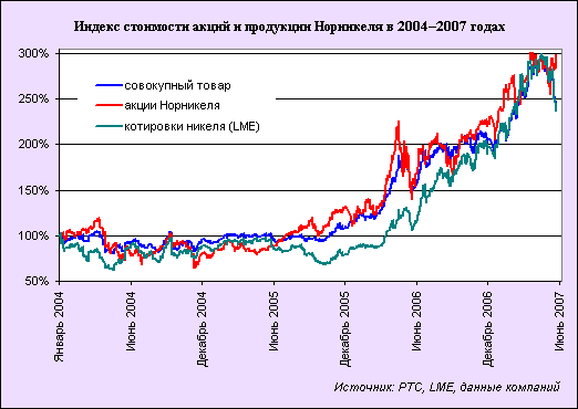 «Норникель» от утраты лидерства по никелю фактически ничего не потерял. Во-первых, его производство диверсифицировано по целой группе металлов (никель, медь, палладий, платина, кобальт и т. д.). Во-вторых, их рост цен (т. е. рост цен на продукцию «Норникеля») в 2006–2007 гг. в разы перекрыл все прогнозы.