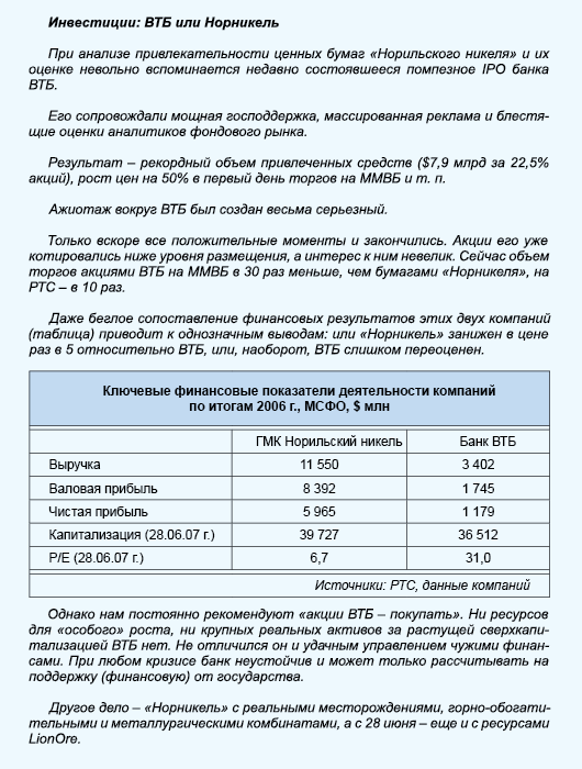 ГМК «Норильский никель» в этом анализе выглядит анахронизмом. К примеру, его индекс P/E за IV квартал 2006 г. составляет крайне редкое значение 2,4. Причем в целом за последние годы значение P/E не превышало 10.