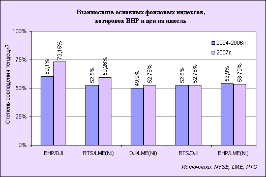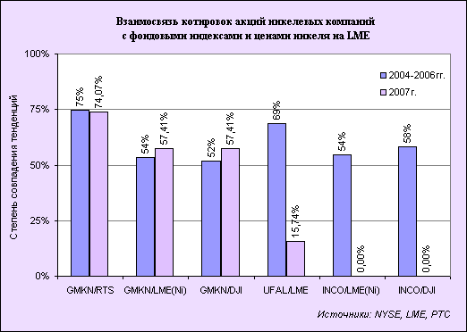 Индекс DJI, прежде не жаловавший котировки металла на LME, в 2007 г. словно впервые обратил на них свое внимание. Зависимость же российского индекса РТС от цен никеля растет буквально на глазах – с 52,5% до 59%. Он словно заменяет нефть, многие годы бывшую ориентиром для российского фондового рынка.