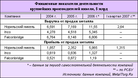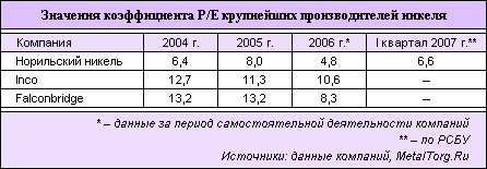Другие возможные пары никелевых компаний для сравнения – российский «Уфалейникель» или «Южуралникель» и, например, канадский Falconbridge – еще более сложны. Информация о результатах деятельности российских предприятий крайне скудна, выпуск никеля мал, а торги их акциями фактически отсутствуют. Более того – канадский объект для сравнения утрачен: с середины 2006 г. Falconbridge куплен Xstrata.