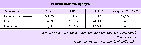 По прибыли на акцию «Норникель» тоже в лидерах: $12,56 на акцию в первом полугодии 2006 г. против $3,45 на акцию у Inco и $3,17 на акцию у Falconbridge. И даже если бы канадские конкуренты сохранили самостоятельность, к концу года они могли претендовать только на поощрительные призы – по итогам 2006 г. прибыль «Норникеля» превысила $31 на акцию.