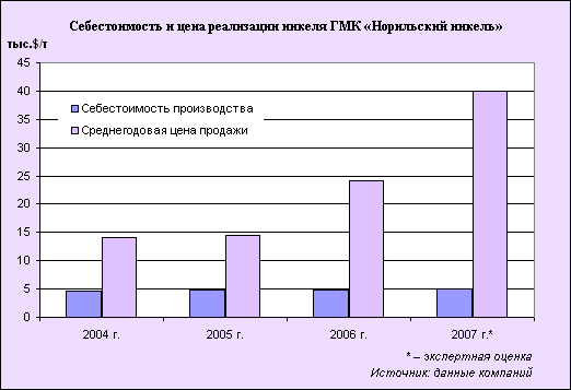 К примеру, в 2006 г. себестоимость добычи никеля составила $4477/5701 за тонну на Таймырских и Кольских месторождениях ГМК соответственно. Себестоимость добычи никеля сравнительно стабильна, растет довольно медленно: с 2003 г. в Заполярном филиале она увеличилась всего на $500. Средняя себестоимость производства всех металлов, выпускаемых ГМК, более подвижна, за 2006 г. выросла на 28% и составила $3158 за т.