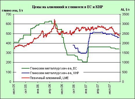 Поддержку ценам на глинозем также может оказать растущий спрос на алюминий в КНР. По оценке Chalco, в 2007 г. он должен увеличиться на 33% и достичь 11,5–12 млн т. Дополнительным стимулом для наращивания объемов производства стало снижение цен на глинозем при высокой цене рафинированного металла, что привело к возобновлению производства на некоторых предприятиях.