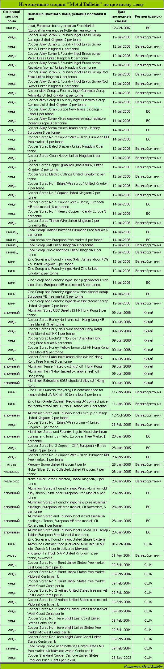 Прочие рынки лома в последние годы анализировать становится все сложнее. Авторитетный Metal Bulletin, например, исключил публикацию 66 (!) ценовых сводок по цветному лому (по странам ЕС, Великобритании, США и Китая). Их перечень – в таблице 2.