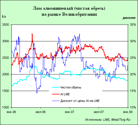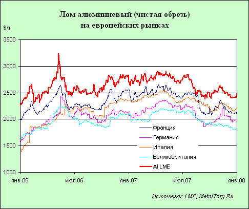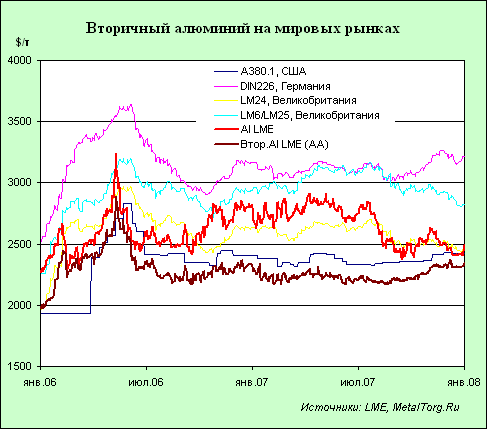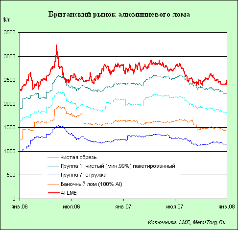 В 2006–2007 гг. алюминий по ценам был наиболее стабильным среди биржевых металлов. Несмотря на краткий ценовой пик весной 2006 г., в основном цены держались в пределах $2500–2800 за т, а разница среднегодовых цен этих двух лет едва превышает 2%. Казалось бы, что это гарантирует наиболее стабильную ситуацию и с ломом алюминия.