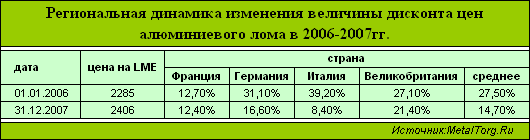 В среднем по крупнейшим европейским рынкам дисконт цен алюминиевого лома по отношению к ценам LME сократился с 27,5% до 15%, что говорит о существенном росте спроса на лом (таблица 1). Что, впрочем, неудивительно – первичный металл в 2005 г. стоил (в среднем) $1900 за т, а в 2007 г. – $2660 за т.