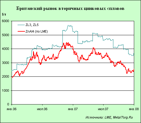Для сравнения рынок вторичных цинковых сплавов Великобритании твердо решил оторваться от цен LME. При схожей динамике разница цен между ними явно увеличивается – если в начале 2006 г. за вторичные цинковые сплавы просили около $2440 за т при цене материалов на LME $1930, то к концу 2007 г. разброс цен достиг 50% по отношению к цене LME. Все это говорит только об одном – быстрый рост цен на цинк заставил его потребителей все более активно использовать вторичные материалы (рис. 5).
