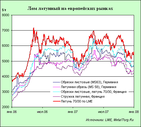 Латунный лом пользуется практически такой же популярностью, что и медный, в силу широкого применения продуктов переработки. Однако, в отличие от медного лома, время реакции на изменение цен LME составляет уже не дни, а недели (рис. 7). Наблюдается также и перераспределение спроса на европейских рынках – цены на обрезки латунных листов во Франции и Германии к концу 2007 г. сравнялись, хотя в течение года цены во Франции были выше.