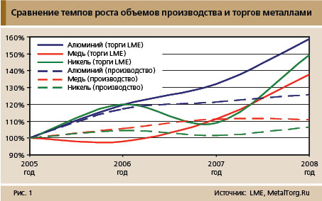 Как следует из статистики биржи, обороты ее площадок, количество участников и сделок неуклонно растут. По внешним признакам всё «в этом хозяйстве» в последние годы более чем благополучно. К примеру, темпы роста торговли на LME с 2005 г. (принят за 100%) были гораздо выше, чем у реального производства и потребления металлов (рис. 1).