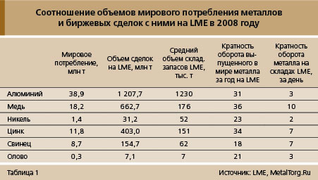 Если сопоставить обороты и запасы LME в физическом выражении (тоннах) с объемами годового потребления металлов (табл. 1), то вырисовывается довольно интересная картина.