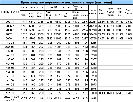 С 2004 по 2008 год доля Китая в мировом выпуске алюминия быстро выросла с 23 до 34%. Причем считалось, что мощную динамику производства китайского алюминия ограничивает только дефицит электроэнергии в стране. Однако за считанные месяцы последнего квартала 2008г. распределение ролей на мировом рынке алюминия «откатилось» к показателям 2006 года – спад спроса на крылатый металл (на фоне высоких издержек производства) Китай почувствовал более многих других стран.