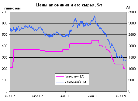 Во-первых, вслед за металлом стали снижаться цены на основное алюминиевое сырье – глинозем. И к концу 2008 года на рынке ЕС он подешевел до $200 за тонну. Схожая ситуация развивалась на китайском рынке. Китайская алюминиевая корпорация (Chalco) – крупнейший производитель алюминия и глинозема в стране- начиная с июня 2008 года, когда цена составляла 4200 юаней КНР за тонну глинозема, понижала цену 5 раз (в общей сложности на 52%). Только 10 января (через 2 недели после 23% снижения) произошел 10% рост цены на глинозем (до 2200 юаней за тонну). По мнению специалистов, это говорит о некой стабилизации на рынке алюминия и его сырья.