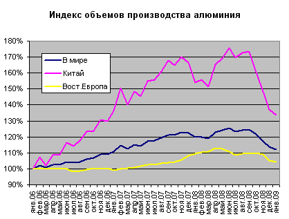 В России картина еще контрастнее. По данным Росстата, январский выпуск алюминия снизился на 2,9% к прошлому году, в то время как стали – упал на 39,8%. В итоге, доля России на мировом рынке алюминия вновь превысила 11%. Справедливости ради отметим, что не только за счет успехов ОК «Русал»: с ноября по январь 2009 года заметно сократил производство основной производитель алюминия в мире – Китай.