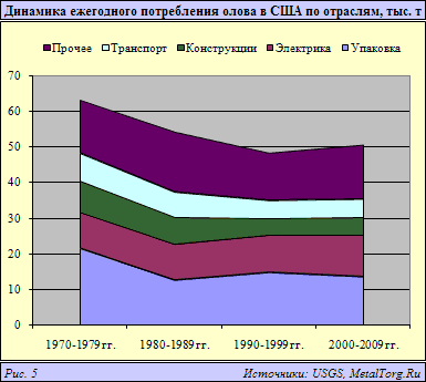 Однако, несмотря на вывод значительных производственных мощностей в Юго-Восточную Азию, спрос на олово не торопится сокращаться и на Западе, причем даже в электронном секторе. Так, в США за последние 20 лет сократились запросы на этот металл только со стороны строительства (рис.5). В упаковочной промышленности спрос постоянен, машиностроение, а особенно автомобилестроение, по-прежнему не может отказаться от баббитовых подшипников, да и в других областях применения олово не сдает своих позиций.
