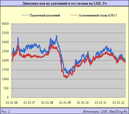 Далее два года торговцы жили надеждами на восстановление, которые вроде бы даже начали сбываться. Но уже в середине 2011 г. стало ясно, что оптимизм придется отложить в долгий ящик. Цены сплавов двинулись вниз (рис. 2), опустившись сначала ниже себестоимости производства первичного алюминия в Европе, потом – в Китае, а позже – даже по сравнению с «Русалом».