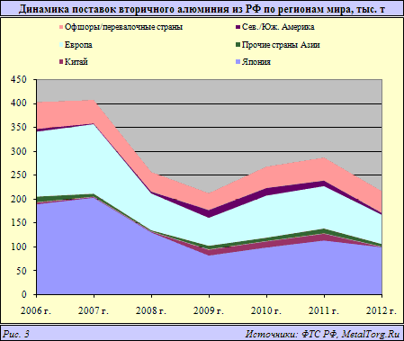 Оторвавшись от европейского рынка в динамичном азиатском направлении, отметим, что поставки в Китай и другие страны региона ведет множество компаний, однако объемы этой торговли сравнительно малы. Зато с кем у нас налажен этот товарообмен, так это с Японией – на ее долю по итогам первых 5 месяцев 2012 г. приходится практически половина всего экспорта вторичных алюминиевых сплавов из РФ!
