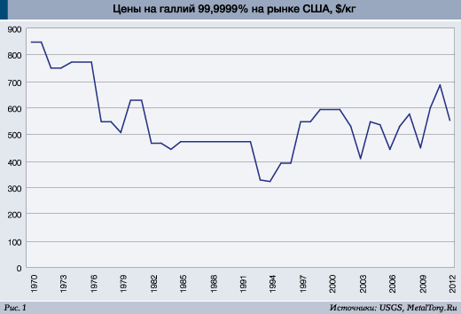 В результате существование, и тем более развитие, галлиевых участков на заводах оказалось в прямой зависимости от динамики цен. Последнее десятилетие ХХ века в этом плане, что называется, не задалось (рис. 1). В том числе – благодаря выброшенным на рынок советским запасам.