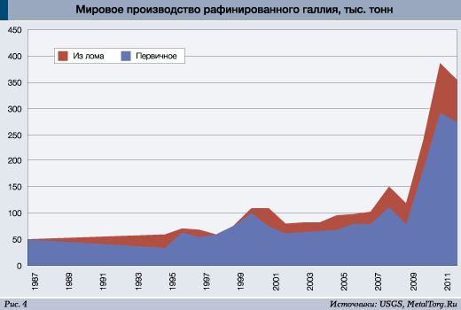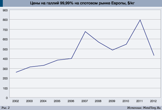 В 2012 г. рост мировых и китайских галлиевых мощностей затормозился. Спрос на продукцию свежепостроенных предприятий оказался слабее ожидаемого, и выпуск галлия даже пришлось сокращать (рис. 4).