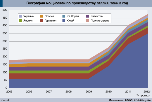 Инвестиции не пропали даром – буквально в один момент Китай стал крупнейшим в мире производителем и потребителем галлийсодержащих изделий, особенно светодиодов, ЖК- и прочих дисплеев. Соответственно, страна стала остро нуждаться в этом металле. Здесь хорошую службу Китаю оказало относительно недавнее и бурное развитие алюминиевой промышленности, в частности глиноземных заводов. Ведь одним из крупнейших производителей галлия стала государственная Aluminum Corporation of China (Chalco). Привычно подключив к процессу более опытных западных «товарищей», власти Поднебесной получили в свое распоряжение самые передовые технологии по производству галлия. Так, в августе 2009 г. MCP Group SA (Бельгия) объявила, что она создала совместное предприятие с китайской компанией Golden Harvest по производству рафинированного галлия различной чистоты. Предприятие, названное MCP Crystal, имеет 3 линии для выпуска 99,99% (4N) галлия и одну – для производства 99,9999% (6N) и 99,99999% (7N) галлия. Мощность завода – 70–80 т в год. В итоге, по предварительным оценкам, к концу 2012 г. суммарные мощности КНР по производству галлия превысили 300 т в год (рис. 3). Это более чем 2/3 общемирового производства.