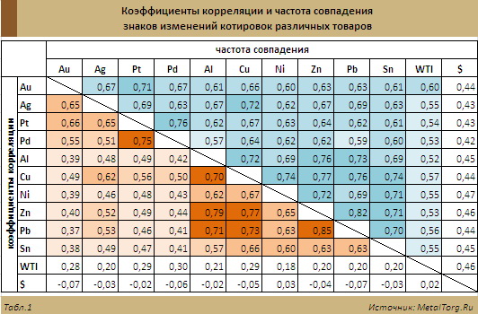 Остается принципиальный вопрос цен. Но как определить, действительно ли столь велика роль инвесторов, как нам это кажется? Может быть, замеченная синхронность цен – всего-навсего результат воздействия общемирового спада на металлургию? Один из способов понять это – проверить, хотя бы простейшими методами, синхронность движения цен цветных металлов и каких-нибудь иных активов, на которые влияние промышленности минимально. В качестве такой «контрольной группы» мы выбрали котировки драгоценных металлов, нефти (WTI) и курса доллара по отношению к евро. Для исключения влияния общего тренда на картину было решено оценивать корреляцию разностей цен последовательных торговых дней за период с 1 января 2012 г. по середину августа текущего года (табл. 1).