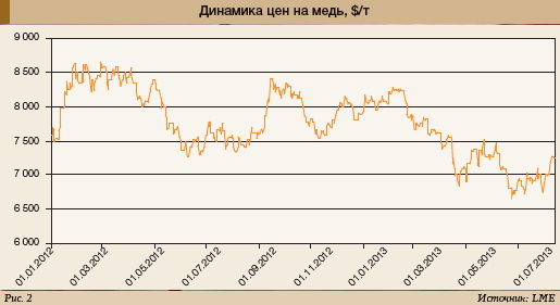 Однако одновременно налицо и торможение спроса. Согласно прогнозу International Copper Study Group (ICSG), избыток на рынке меди составит в текущем году 415–417 тыс. т на фоне нарастающего отставания спроса от производства. В 2014 г., по оценкам группы, рынок меди ждет еще больший избыток в размере около 681 тыс. т вследствие увеличения производства на новых и существующих рудниках – по сравнению с дефицитом на уровне 393 тыс. т по итогам 2012 г.