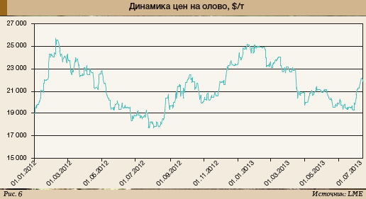В результате, хотя дефицит металла совместно с угрозами индонезийских компаний свернуть производство из-за низкой рентабельности и поддержали на некоторое время цены олова (рис.6), информация о фактическом росте отгрузок из Индонезии не оставила им шансов. Увеличение поставок было зафиксировано еще в декабре 2012 г., и в I квартале 2013 г. При этом Индонезия увеличила экспорт на 20% относительно аналогичного периода прошлого года, а по итогам полугодия рост составил 16%, достигнув 55 тыс. т. Крупнейшие производители прогнозировали по итогам года увеличение поставок до 100 тыс. т, чем загоняли цены на металл все ниже – ведь спрос в Китае, который является главным потребителем олова, сокращался.