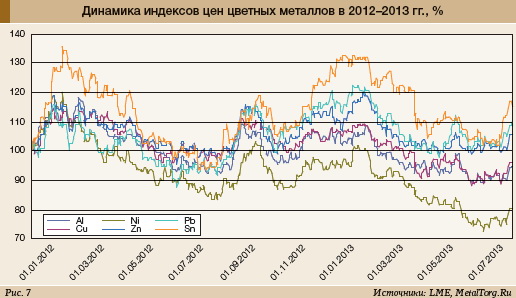 В процессе подготовки этой статьи мы много работали с ценовыми сводками и обратили внимание, что динамика цен цветных металлов в общих чертах соответствовала складывающейся ситуации на рынке – весной и летом 2013г., как и в первой половине 2012 года, цены вновь падали. Но, что удивительно, их изменения в последние годы проходят исключительно синхронно (рис. 7).