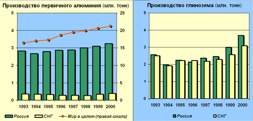 Прошедший год остался, пожалуй, самым успешным для отрасли в последнем десятилетии, а возможно и в ближайшей перспективе. В 2000 году выпуск первичного алюминия увеличился на 2.5% по сравнению с 1999 годом и составил 3.25 млн. тонн. При этом действующие мощности предприятий были загружены на 99.7%. Рост наблюдался также и в отрасли производства бокситов – основного компонента при производстве первичного алюминия. В том же 2000 году рост производства бокситов составил 4.1% и достиг уровня в 2.46 млн. тонн. Этого количества глинозема, естественно, не хватает для производства такого количества первичного алюминия, поэтому Россия является нетто-импортером глинозема, ввозя его, в частности, из Гвинеи, Австралии, Бразилии и т.д. Производство алюминия из собственного сырья в России не превышает 40% от общих объемов выпуска и это наиболее сильное ограничение сдерживающее рост мощностей внутри страны.