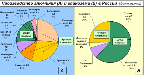 За три последних года при общем росте мирового производства доля России неуклонно снижалась, несмотря на увеличение выпуска, и связано это было с постоянным вводом новых мощностей крупнейшими мировыми производителями – в частности, Alcan и Alcoa – и различными ограничениями на поставку на западные рынки. Тем не менее, внутрироссийское производство постоянно росло, до 2-5% ежегодно. К тому же весь прошедший год в России активно формировались альянсы в отрасли, что привело к значительной экономии издержек и позволило повысит маневренность и эффективность производства металла внутри России. Кроме России экспансия отечественных металлургов распространилась и в сопредельные государства – Украину, Армению, Румынию, а также и страны дальнего зарубежья – в частности в Гвинею, где не так давно один из операторов рынка приобрел местного производителя глинозема. Рассмотрим подробнее положение основных игроков на рынке.