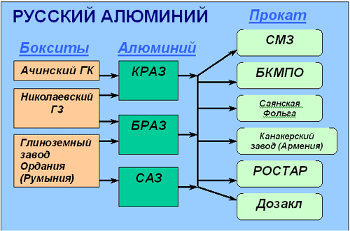 Производимый глинозем поступает на алюминиевые заводы: Братский, Красноярский и Саянский заводы (см. график 2). Эти предприятия расположены около крупных генерирующих мощностей, что позволяет существенно экономить на энерготарифах. Производимый на этих предприятиях первичный алюминий на 80% экспортируется. Остальной перерабатывается на принадлежащих холдингу заводах: Саянском алюминиевом, «Саянской Фольге», «Ростаре», и БКМПО (Белая Калитва). Из общего выпуска проката 46% составляют листы и ленты, 30% плиты и прессованные изделия, а также фольга и консервная лента. Специалисты компании определяют сектор производства продукции высокого передела, как чрезвычайно перспективный и планируют в будущем развивать именно это направление.