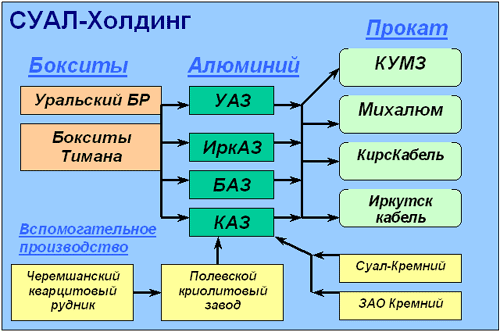 Как видно структура холдинга довольно сбалансирована; практически все встроенные в структуру предприятия являются технологическими цепочками для других предприятий. Это существенно снижает расходы на транзакции и позволяет проводить сбалансированную финансовую политику. Кроме того, относительная локализация структур холдинга в пределах одного региона также позволяет более гибко приспосабливаться к изменяющимся условиям, как-то рыночная конъюнктура или изменения спроса. Одним существенным недостатком является необходимость транспортировки глинозема с Тиманского месторождения (Коми), что после повышения тарифов вызвало рост транспортной составляющей в структуре себестоимости. Так, по мнению топ менеджеров компании в настоящее время эта доля в себестоимости достигла 60%, что вызвало активизацию переговоров руководства компании и Единого тарифного органа об изменении порядка определения стоимость транспортировки.