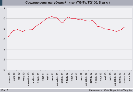 Это тем более важно, что мировые цены на первичное сырье – губчатый титан – в 2012–2013 гг. заметно снизились (рис. 2).