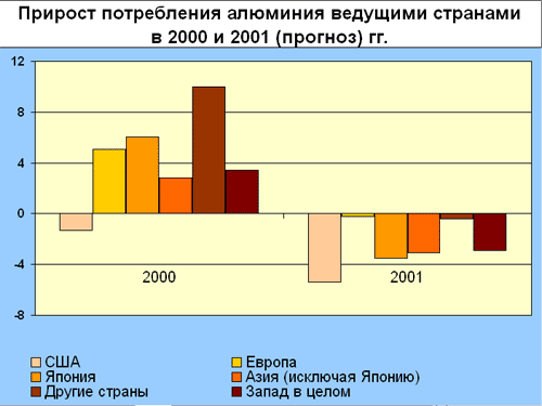 Проблемы алюминиевой индустрии начались не вчера. Уже на протяжении нескольких последних лет наблюдается явное перепроизводство металла, не подкрепленное ростом потребления. Так, например, в США в 2000 году снижение достигло 1% по сравнению с 1999 годом, а по результатам этого года снижение прогнозируется на уровне 5-5.5%.