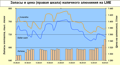 Как видно из графика, находясь весь август в боковом тренде, цены на алюминий достаточно устойчиво находились в диапазоне 1360-1400 $/т. При этом достаточно стабильными оставались и складские запасы. Однако с начала сентября котировки вновь пошли на спад. Это сопровождалось ростом складских запасов металла, что с достаточной точностью может свидетельствовать о длительном понижательном тренде. Всплеск котировок, пришедшийся на 13-14 сентября, носил спекулятивный характер, однако, опасаясь резкого снижения котировок, многие производители увеличили запасы, что перебороло тенденцию к понижению, и уже с начала прошлой недели цены вернулись на прежний уровень.