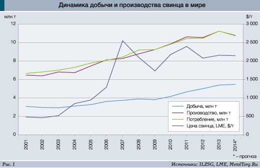 Мировое производство и потребление свинца в 2013 г. увеличились на 3,7 и 4,5% соответственно, гласят данные International Lead & Zinc Study Group (рис. 1).