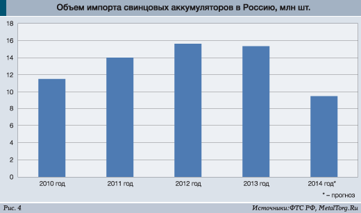 Выйдя в 2010 г. на максимальный после кризиса уровень производства в объеме 6 млн шт. аккумуляторов в год, они на нем и остались. Закономерно, что «лишний» свинец вновь и вновь отправляется за границу, а к нам возвращаются готовые автомобили и сами аккумуляторы. В основном (около 40% поставок автобатарей) – из Китая (рис. 4).