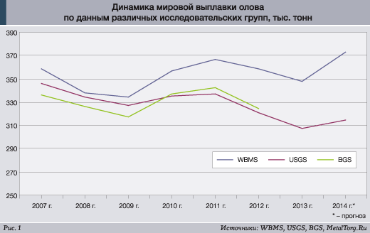 Например, для давным-давно прошедшего и обсчитанного 2011 года британский International Tin Research Institute (ITRI) дает цифру 290 тыс. т добытого олова по всему миру. Британская же геологическая служба (BGS) – 307 тыс. т, Геологическая служба США (USGS) – 256 тыс. т. Аналогичные расхождения царят и в цифрах оценки объемов выплавки олова (рис. 1), но тут их хотя бы можно объяснить различным учетом вторичного переплава.