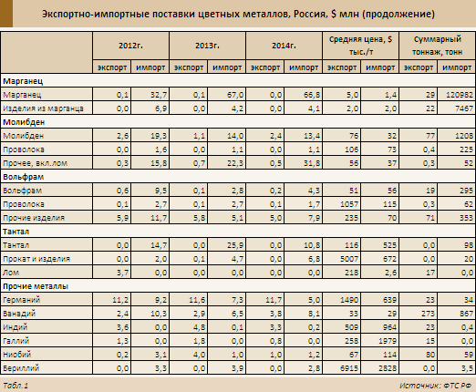 Экспортируем мы в значительных объемах только танталовый лом – в 2012 г. его поставки достигали 10 т, однако к 2014 г. снизились до 1 т. И это говорит о том, что некоторый простор для идей импортозамещения в данном секторе есть. Хотя в стране нет качественного сырья, вторичная переработка тантала вполне возможна. Судя по объемам экспорта лома – в довольно значимых объемах.