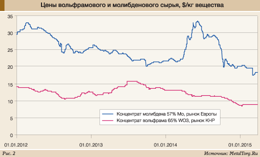 Добавим, что у производителей металлических молибдена и вольфрама дела шли не лучше – ценовая динамика была практически такая же, отличались только абсолютные величины: вольфрамовые прутки вчетверо дороже концентрата, молибденовые – примерно в 1,7 раза.