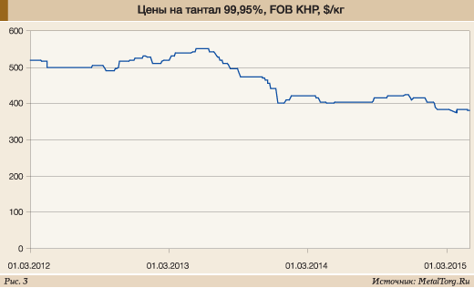 Стоит также отметить, что стоимость зарубежного тантала постепенно снижается – за 2011–2014 гг. она упала с $560 до $490 за кг для необработанного металла и с $720 до $677 за кг проката. Впрочем, могла бы упасть и еще больше – если верить данным китайских экспортеров (рис. 3).