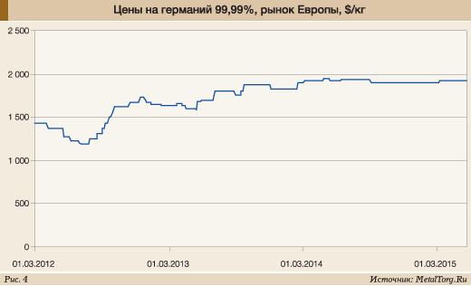 Мировые цены на германий в последнее время достаточно стабильны (рис. 4), с тенденцией к небольшому росту. Так что перспективы у рынка достаточно неплохие.