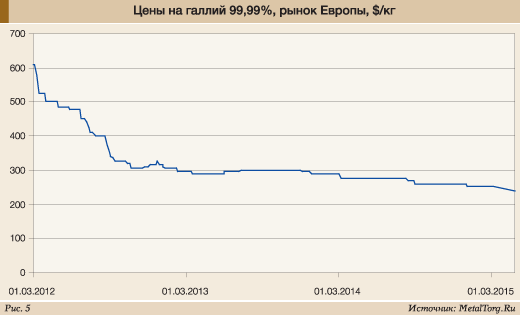 Что из намеченного удалось реализовать на настоящий момент, неясно. Как неясно и реальное положение дел в Пикалево. Тем не менее почти весь отечественный экспорт галлия из страны идет именно из Ленинградской области. Стабильностью он не отличается и колеблется последние годы в интервале 3–8 т в год. Куда именно идут поставки, отследить трудно, т.к. Нидерланды и Великобритания – явно не конечные потребители этого редкого металла. В 2013 г. объем экспорта составил более 7 т, в 2014 г. – 3,6 т по средним ценам $280 и $240 за кг соответственно, что вполне отражало ситуацию с динамикой цен на зарубежных рынках (рис. 5).