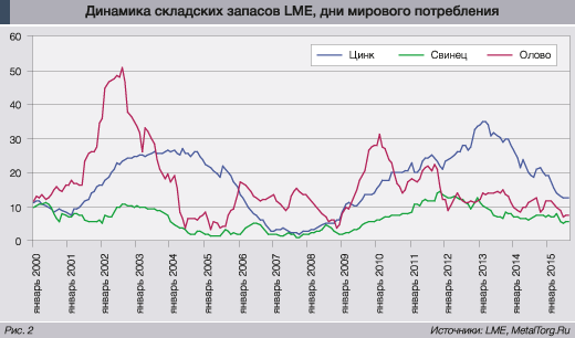Как и в случае алюминия, меди и никеля, очевидной взаимосвязи динамики цен с уровнем и изменением складских запасов Лондонской биржи металлов (LME) не наблюдается (рис. 2).