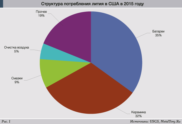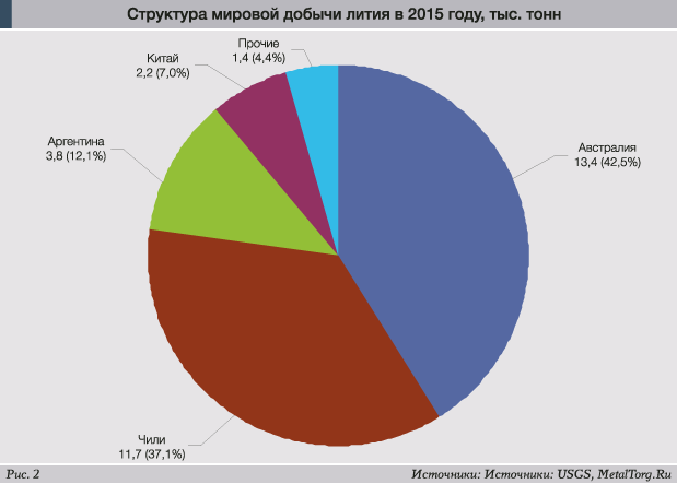 Мировая добыча лития в 2015 году, по оценкам USGS, составила 32,5 тыс. тонн (рис. 2).