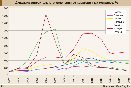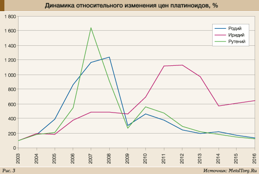 Менее определенно будущее рутения. Ажиотаж 2006–2007 годов прошел, производители жестких дисков освоили новую на тот момент технологию, создали запасы, а тут еще навалился кризис 2008 года. Потребности электронной промышленности сократились с 40 т в 2006 году до 11,6 т в 2009-м. Затем последовало небольшое оживление, но вскоре – новый провал: к 2012 году потребности в рутении сократились до 7,7 т. Хотя они постепенно увеличиваются последние несколько лет (15 т в 2016 году), инерционность добывающей промышленности привела к устойчивому превышению поставок над потреблением и негативному ценовому тренду (рис. 3).