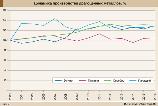 Платина и палладий – более промышленные металлы, и их цены колеблются не столь активно. Поддержку оказывает и небольшое сокращение объемов выпуска (рис. 2).