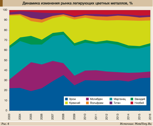 Рынок легирующих металлов, входящих в состав ферросплавов, долгое время был, пожалуй, самым «разношерстным» среди всех. Тройка лидеров в виде хрома, марганца и кремния разбавлялась то молибденом, то ванадием и титаном. Но примерно с 2011 года ситуация стабилизировалась, цены успокоились и доли рынка явно закрепились (рис. 4).